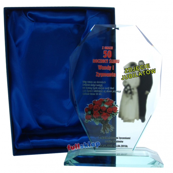 Pamiątka Rocznicy Ślubu na wiele lat. Prezentowaną statuetkę szklaną w naszym sklepie internetowym kupicie z możliwością wydrukowania na niej własnej wyjątkowej dedykacji oraz fotografię.